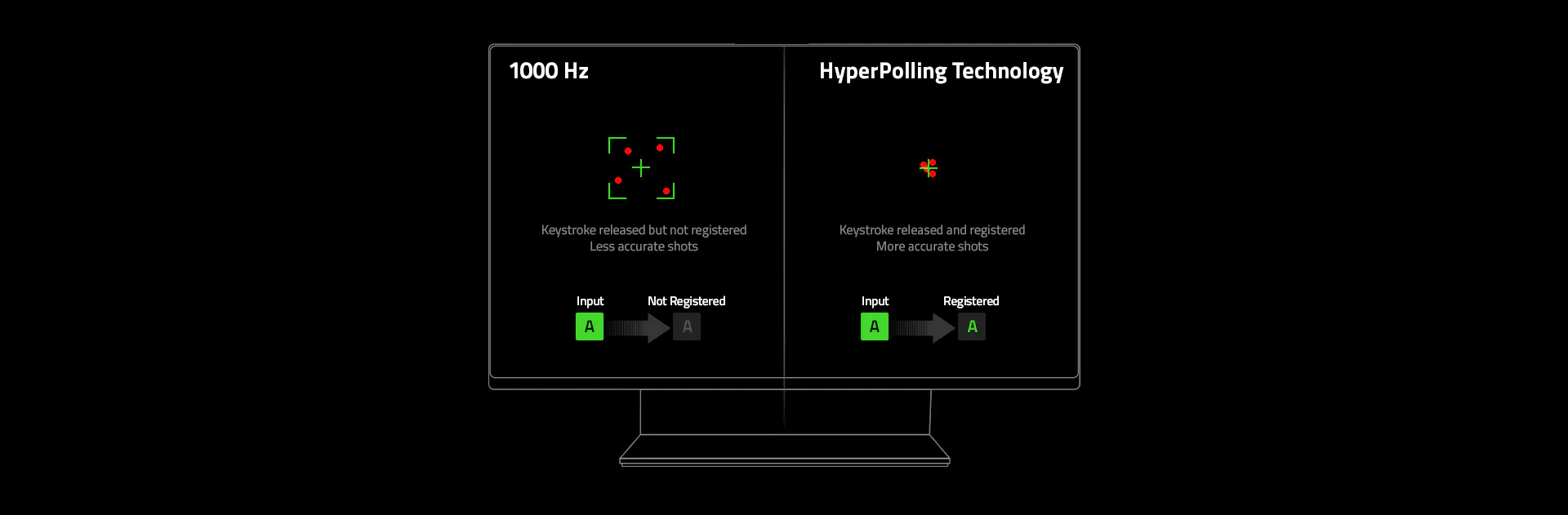 与平均轮询率为 1000 Hz 的其他外设相比,轮询率为 8000 Hz 的 Razer HyperPolling 设备每秒向电脑发送的数据量可达 8 倍,从而将输入延迟从 1 毫秒大幅降低至 0.125 毫秒。